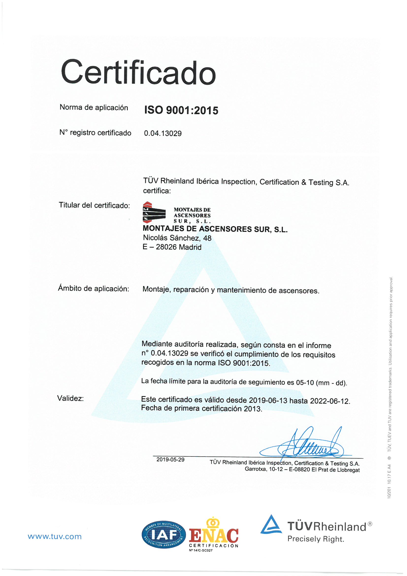 A partir del 10.05.2013 Montajes de Ascensores Sur, S.L. pasa a formar parte de TUV.COM, una base de datos a nivel internacional que muestra las características de todos los sistemas de gestión certificados por las empresas que pertenecen a TÜV Rheinland Group. Si introducen nuestro ID "9105074428" en el apartado TUV.COM de la página web: www.tuv.es podrán consultar nuestras certificaciones así como la estructura y organización de la empresa.